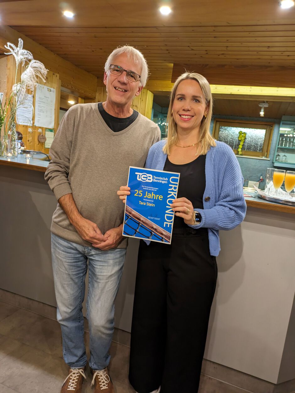 Von unserem bewährten Eventteam Frances Robinson und Beate Büchs mit Helfern wunderbar vorbereitet, fanden sich über 30 Mitglieder ein um einen schönen Abend miteinander zu verbringen. Nach seiner Begrüßungsansprache ehrte Vorstand Oliver Gerst Tara Stein für ihr 25jähriges Vereinsjubiläum. In Abwesenheit geehrt wurden Eberhard und Claudia Schneider, Johannes Essig und Sebastian Braun für 40 Jahre Mitgliedschaft beim TC Benningen.